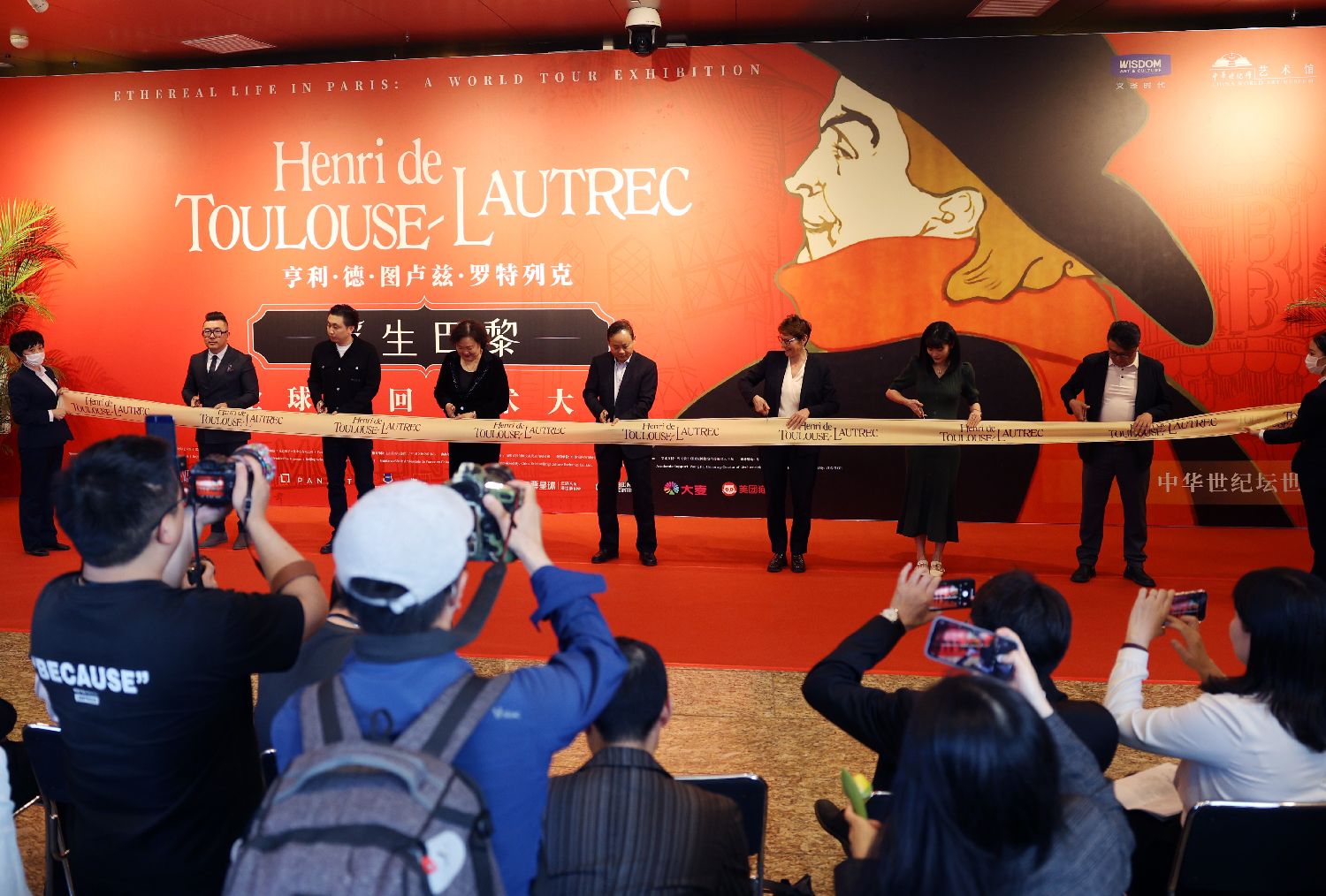 2023年4月19日,与会嘉宾为活动开幕剪彩。 当日,《浮生巴黎——亨利·德·图卢兹-罗特列克全球巡回艺术大展》在北京中华世纪坛开幕。 据介绍,展览分为四个单元展示罗特列克作品系统性的收藏,呈现了近120套230多件与艺术家有关的珍贵藏品,引领观众回到19世纪末巴黎的夜晚,寻找当年的蒙马特与红磨坊,亲身感受艺术家如同苦艾酒的一生。(图片来源:本文图片均由本报特约记者李大鹏摄)