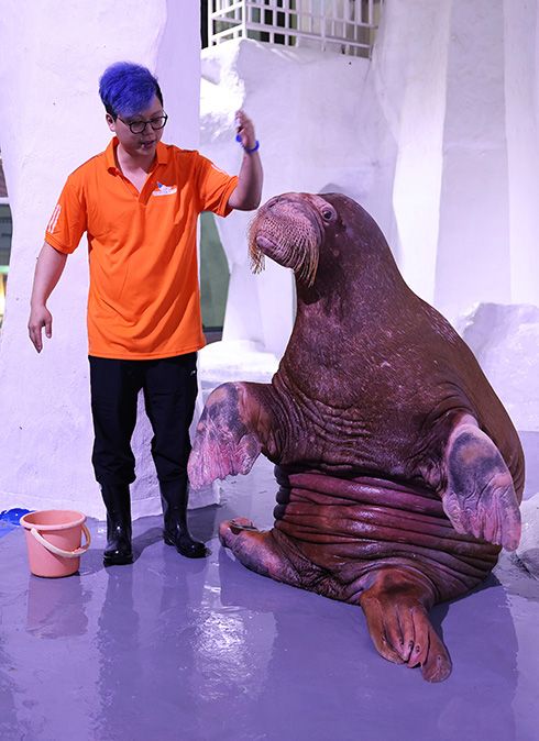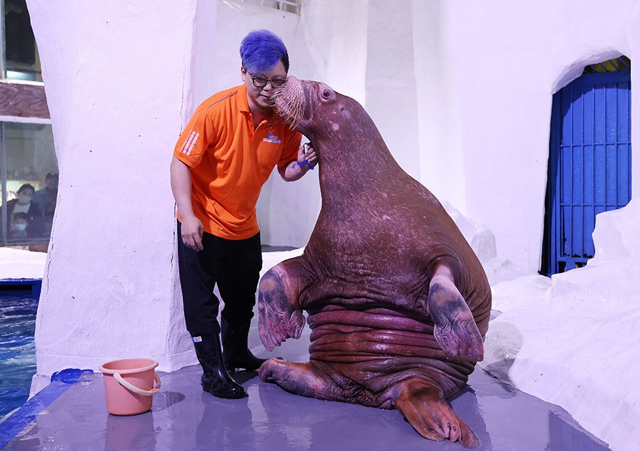海象“艾米”虽然有着庞大的身躯,但本质上却是个害羞的小“萝莉”,特别喜欢和饲养员“爸爸”贴贴。(图片来源:中新网)