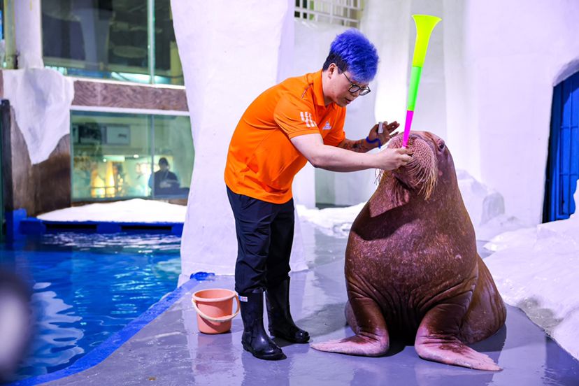 4月22日,饲养员与海象互动。(图片来源:中新社)