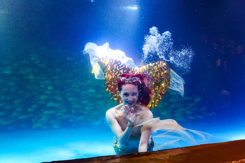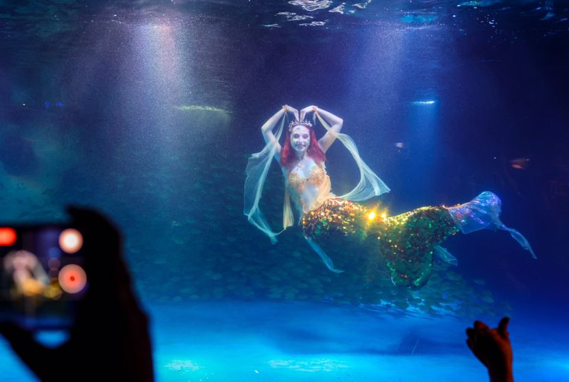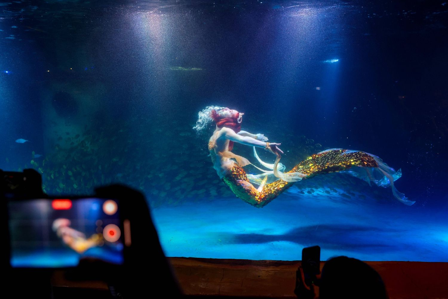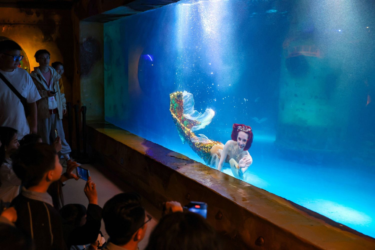 “人鱼公主”在海底世界翩翩起舞和游客互动。(图片来源:南京紫金新闻)