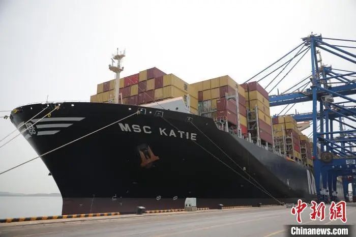5月8日,“地中海凯蒂”(MSC KATIE)轮在辽宁港口集团大连集装箱码头首航。(图片来源:中新网)