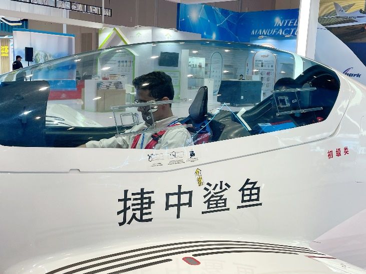 图为采访团成员在展会体验“鲨鱼飞机”。(图片来源:中国日报网)