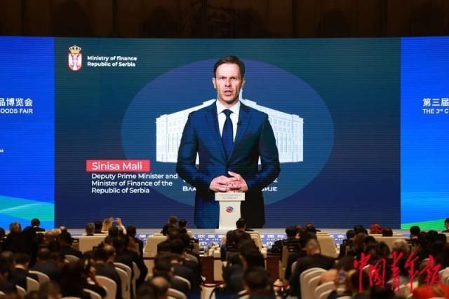 5月16日,浙江宁波,宁波国际会议中心,第三届中国-中东欧国家博览会暨国际消费品博览会开幕式上,塞尔维亚副总理兼财政部部长西尼沙·马利(Sinisa Mali)通过视频致辞。(图片来源:《中国青年报》)