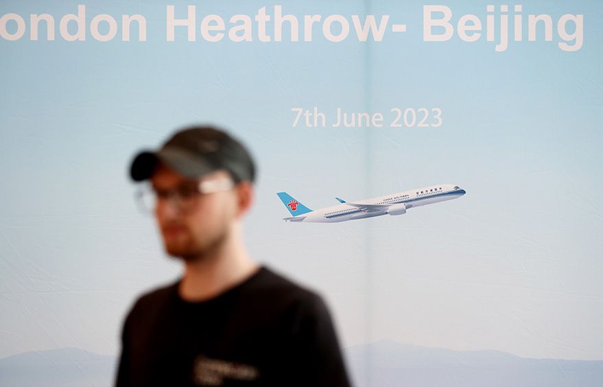 6月7日,在英国伦敦希思罗机场,一名工作人员在航线开通仪式上。(图片来源:新华社)