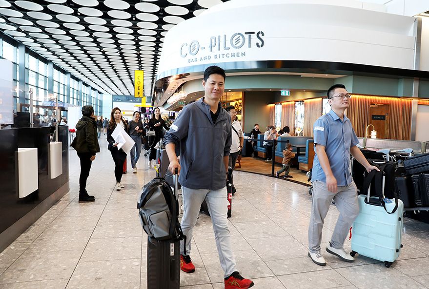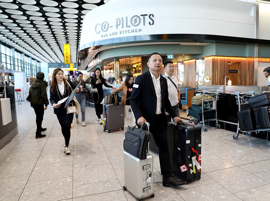 6月7日,搭乘中国南方航空CZ673首班航班的旅客抵达后走在英国伦敦希思罗机场内。(图片来源:新华社)