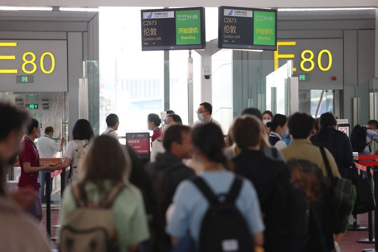 6月7日,旅客排队登机。北京大兴—伦敦希思罗航班每周7班,去程为北京时间11时55分从北京大兴国际机场出发,当地时间15时45分到达英国伦敦希思罗机场,预计航程时间10小时50分钟;回程为当地时间22时30分从英国伦敦希思罗机场出发,北京时间次日15时25分到达北京大兴国际机场,预计航程时间9小时55分钟。(图片来源:《新京报》)