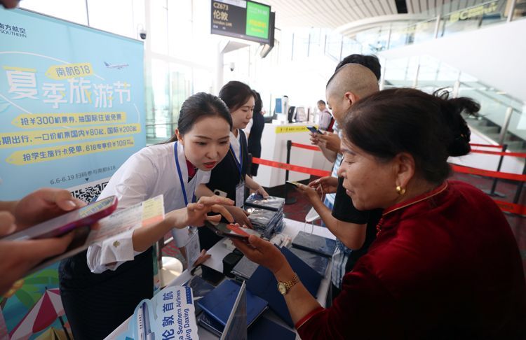 6月7日,南航北京大兴—伦敦航线顺利首航,该航线的开通标志着中英往来一座新的“空中桥梁”架设完成。图为旅客领取纪念品。(图片来源:《新京报》)