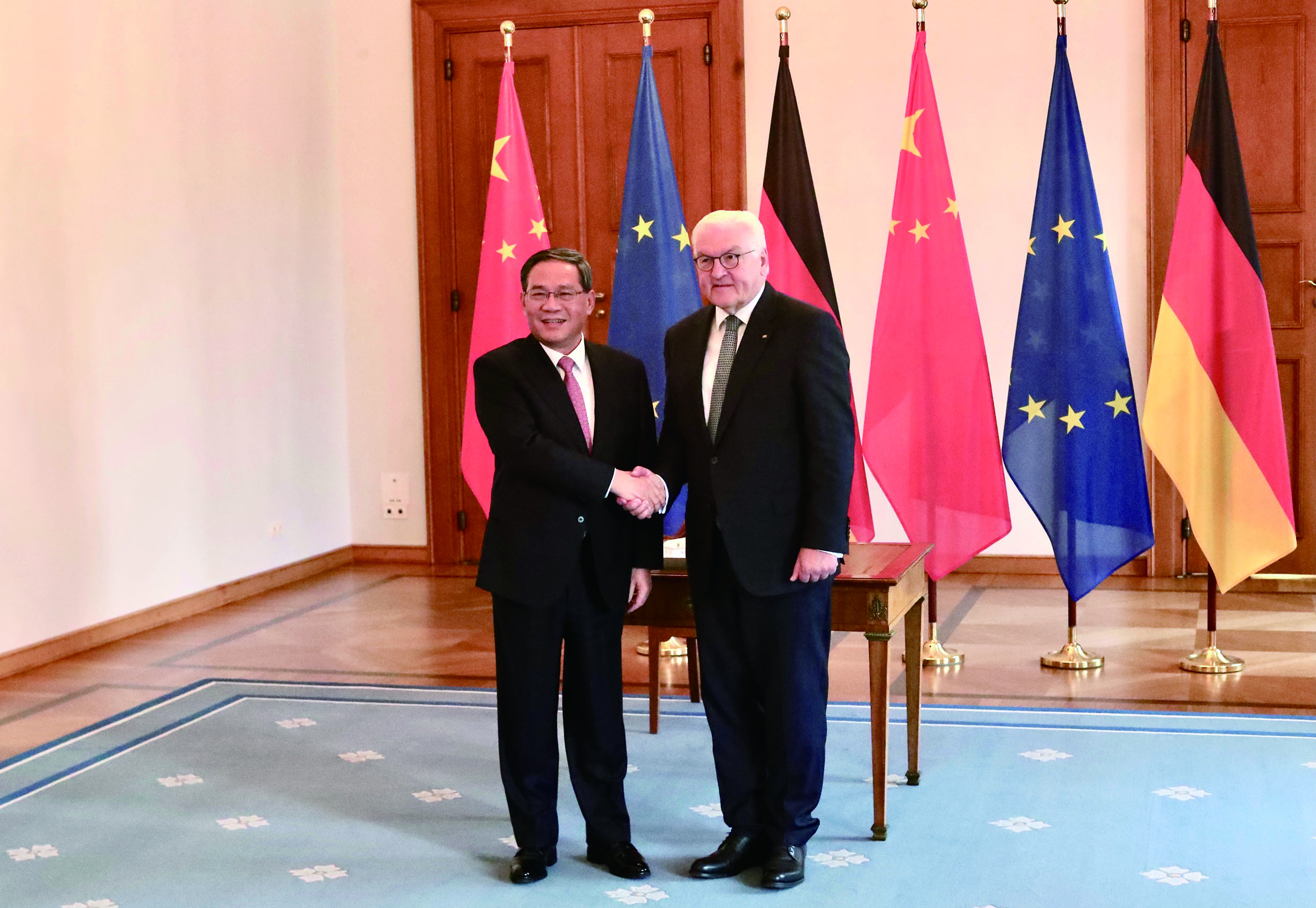 施泰因迈尔请李强转达对习近平的问候,表示德国愿做中国可信任的合作伙伴,共同维护贸易自由化,应对气候变化等挑战。德方反对脱钩,反对任何形式的阵营对抗,愿同中方加强沟通,共同为促进世界和平与发展作出努力。