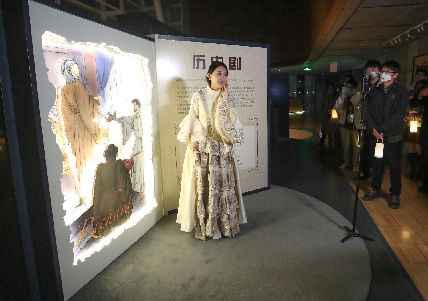 4月23日,“上图之夜”活动在上海图书馆东馆举行。现场读者作为“寻梦者”,被带到不同的阅读场景中,与艺术家互动,重温经典文学作品。图为艺术家表演莎士比亚经典作品。(图片来源:中新社)