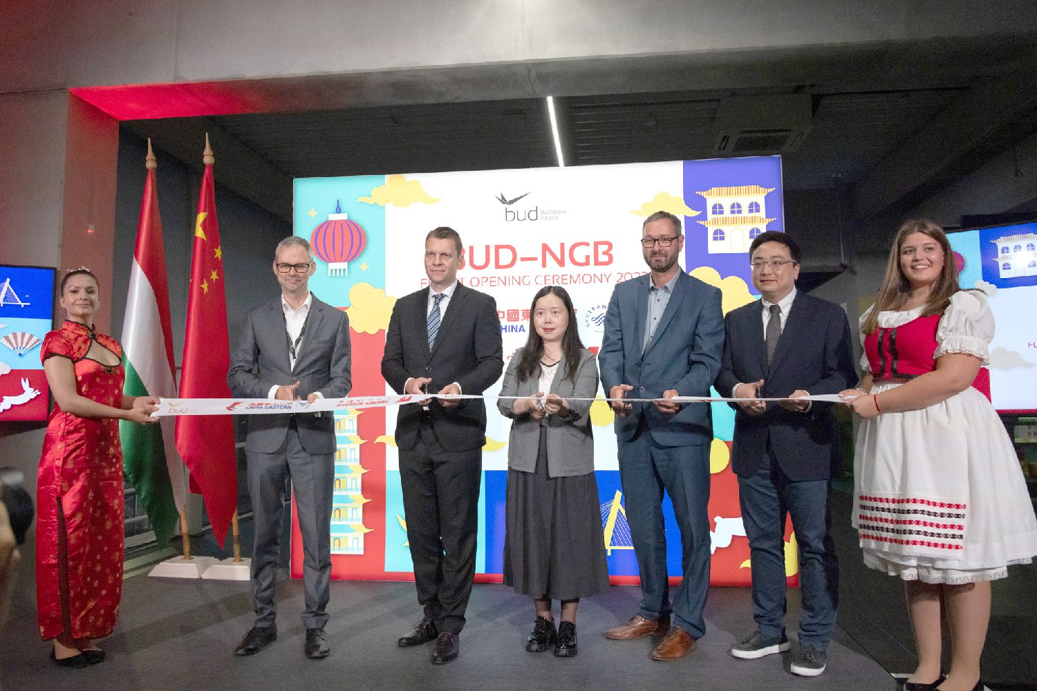 一架从中国宁波栎社国际机场起飞的班机19日晚抵达匈牙利首都布达佩斯李斯特国际机场,这标志着中国东方航空公司宁波至布达佩斯直飞客运航线正式开通。图为19日,在匈牙利首都布达佩斯李斯特国际机场,中匈两国代表在中国东方航空公司宁波至布达佩斯直飞客运航线的开航仪式上剪彩。(图片来源:本文图片除标注外均据新华社)