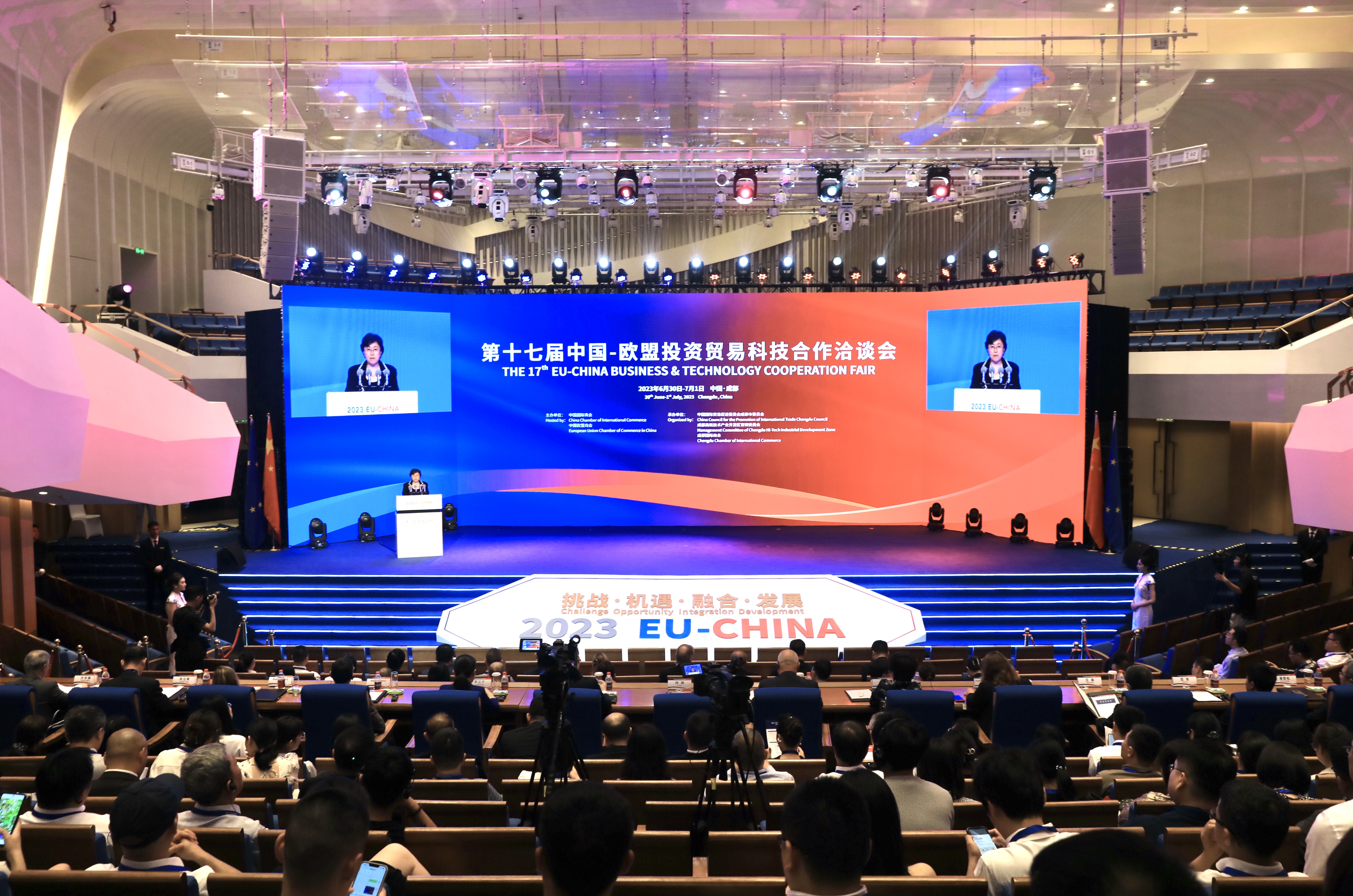 6月30日,第十七届中国—欧盟投资贸易科技合作洽谈会在四川成都开幕,来自各领域600余名嘉宾及代表共同展望中欧经贸合作新趋势。图为欧洽会开幕式现场。(图片来源:中新社)