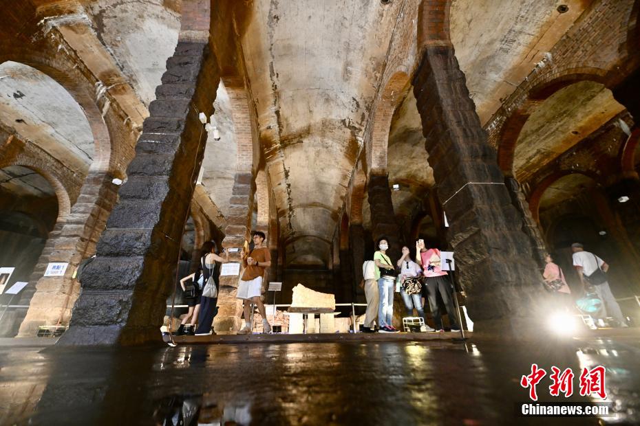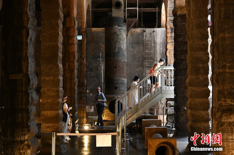 配水库经修复后,内部配以泛黄的灯光更能突显它的古典美。图为7月5日,香港市民参观前深水埗配水库。(图片来源:中新网)