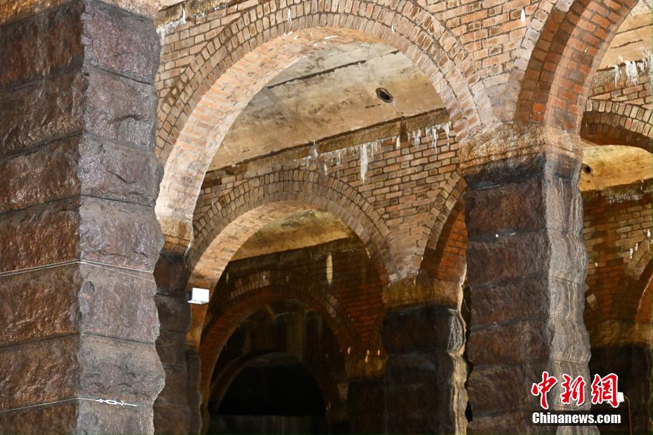 该配水库的建造源于香港开埠初期的供水需要。当时九龙半岛主要依靠地下水供水,但随着人口增长,地下水不敷使用。图为7月5日拍摄香港前深水埗配水库的红砖拱券及花岗石柱。(图片来源:中新社)