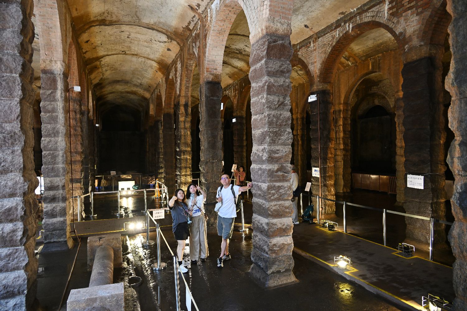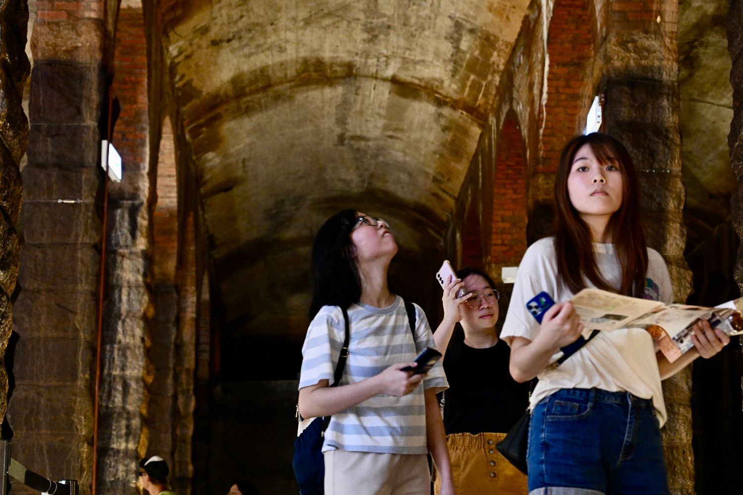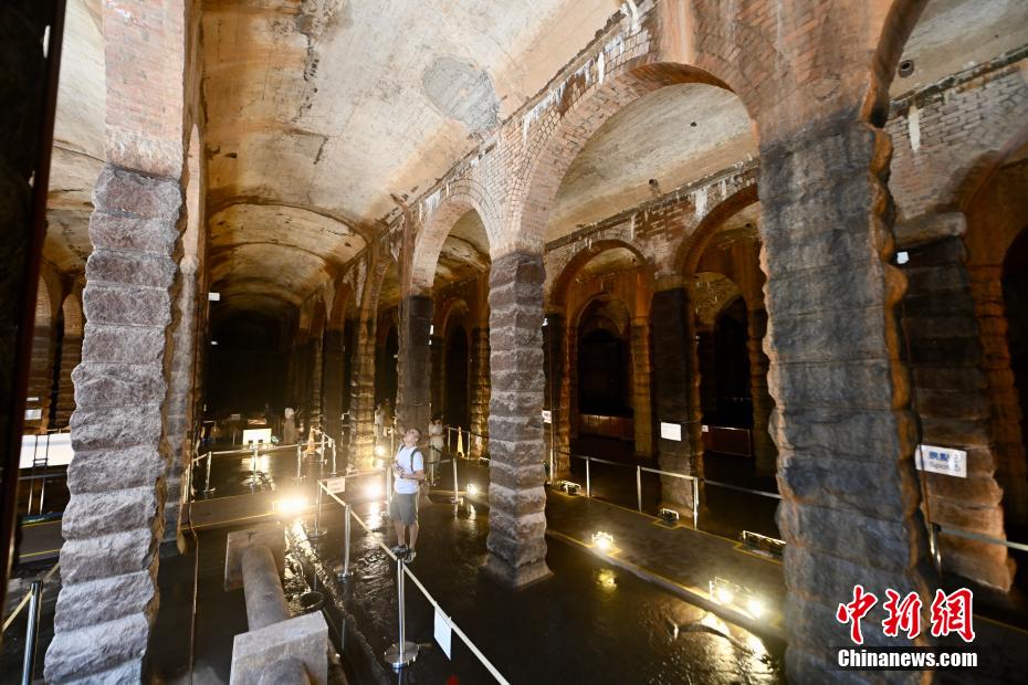 公众在参观配水库时可感受到不同建筑材料、线条及形状构成的建筑美学,排列有序的石柱、层层递进的半圆拱券,给人庄严稳重之感,观众可充分感受欧洲古典建筑之美。图为7月5日,市民参观香港前深水埗配水库。(图片来源:中新网)