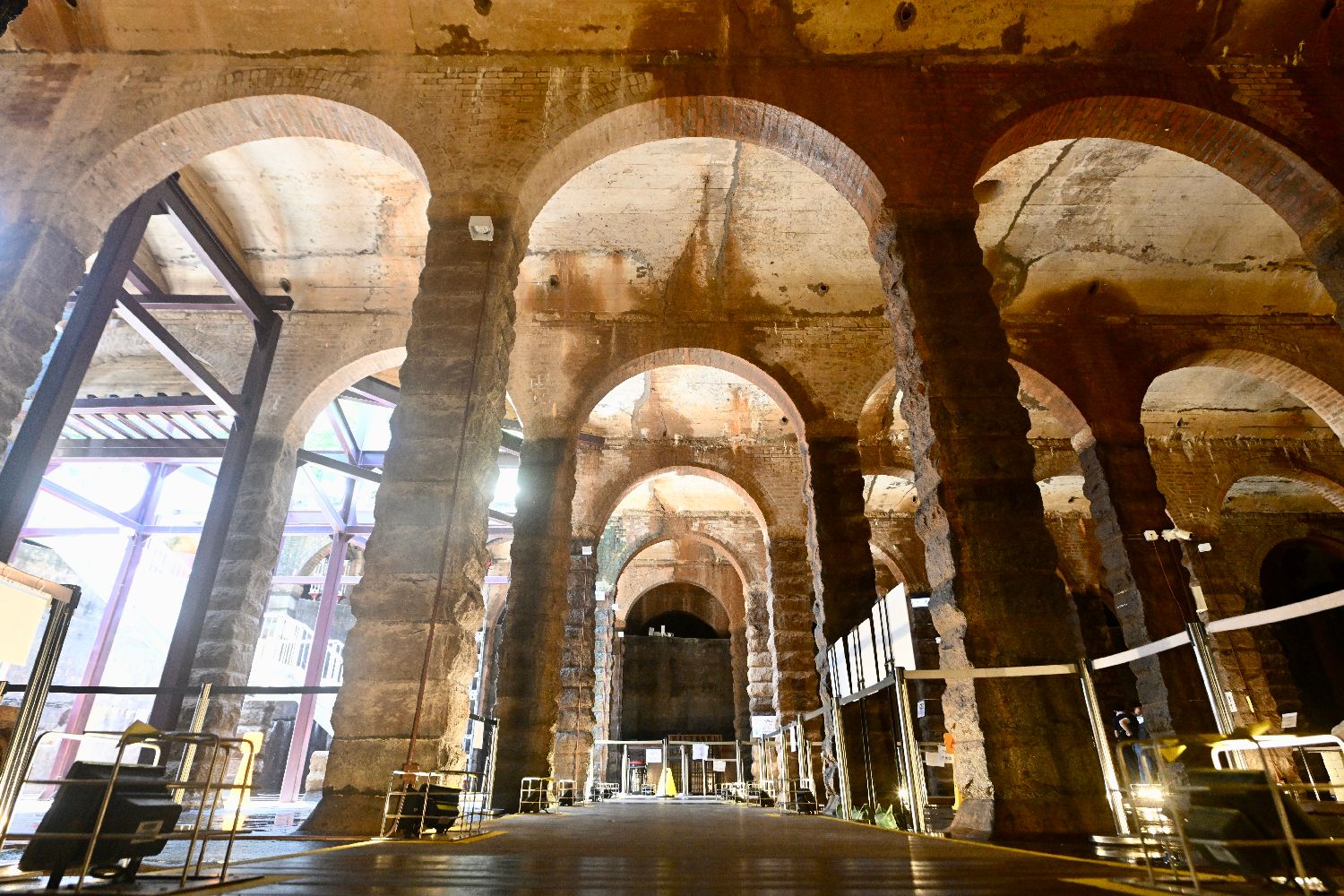 前深水埗配水库是香港首个以圆形筑成的地下配水库,内部以整片混凝土天花建成,并由108条排列有序的花岗石柱支撑。图为7月5日拍摄糅合欧陆工艺与罗马特色修建的香港前深水埗配水库。(图片来源:中新社)