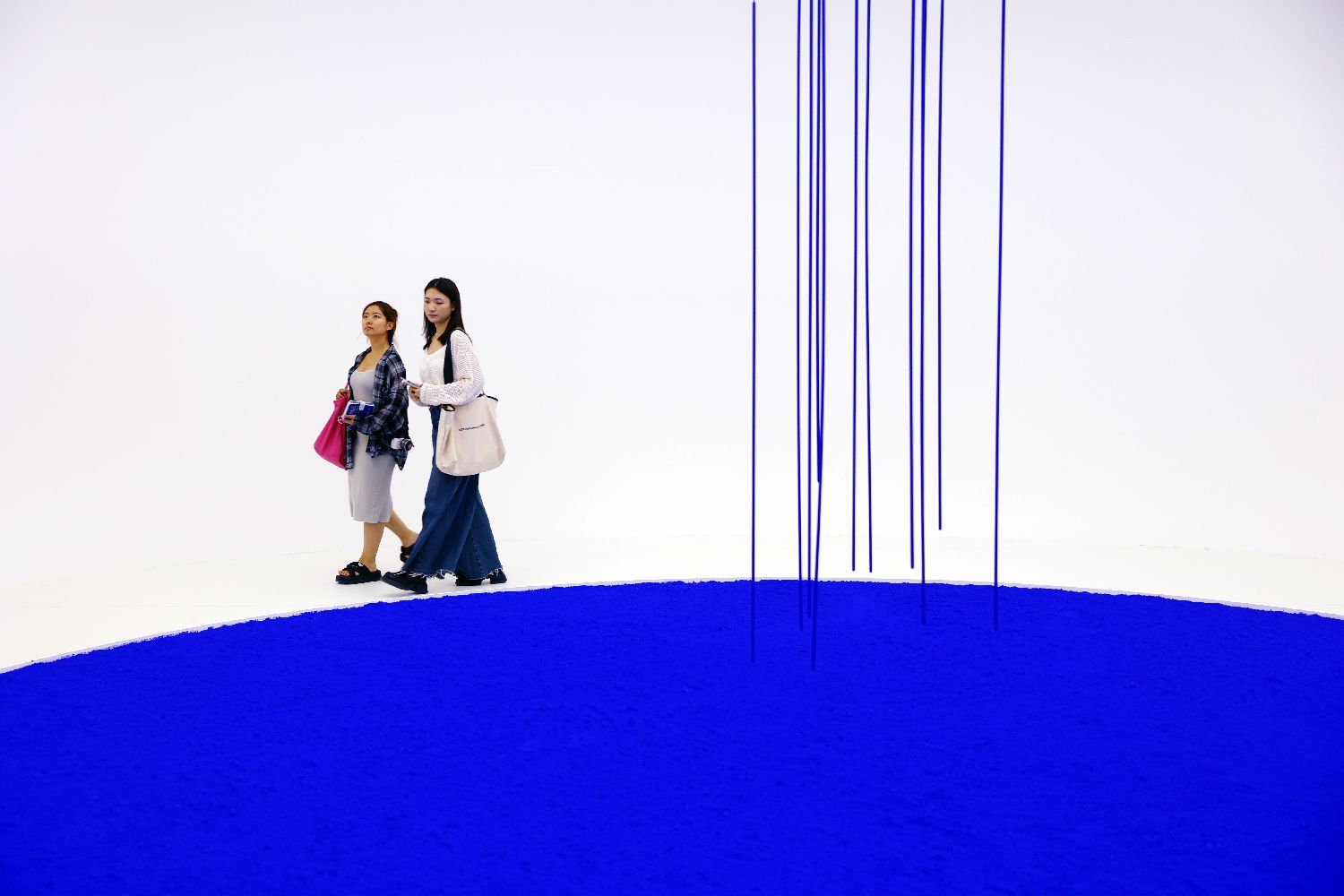 7月5日,参观者边走边欣赏作品《纯颜料》与《蓝雨》。