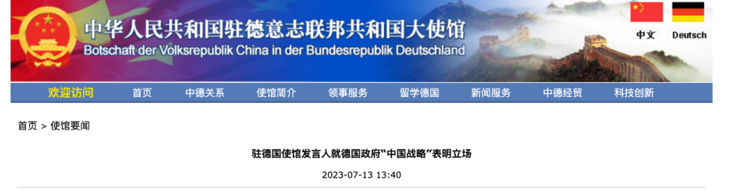 中国驻德大使馆官网发布回应。(图片来源:官网截图)