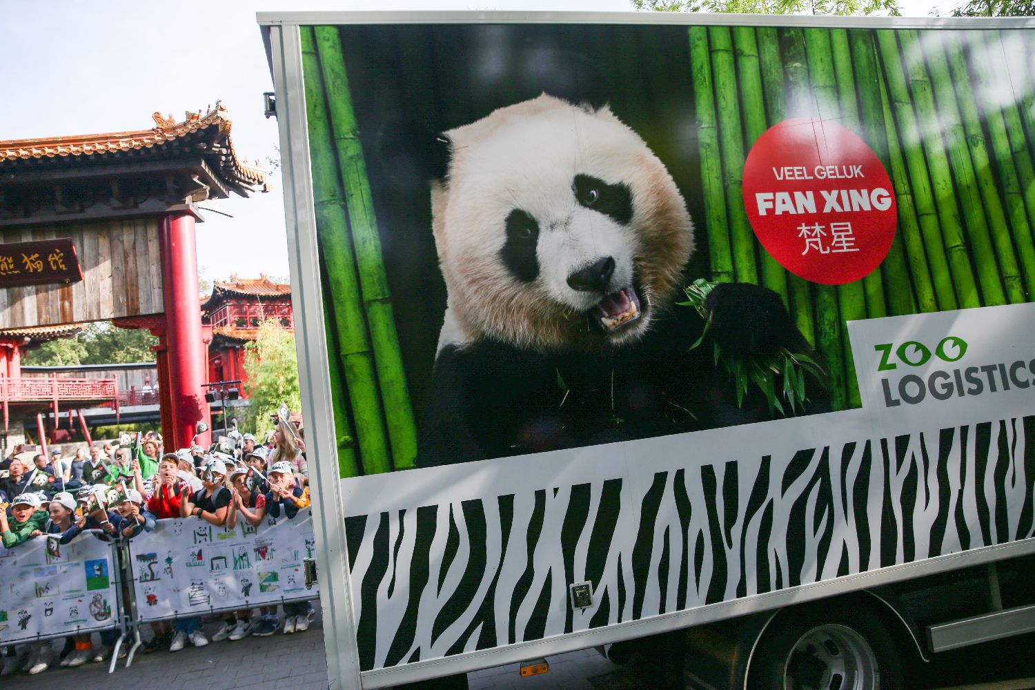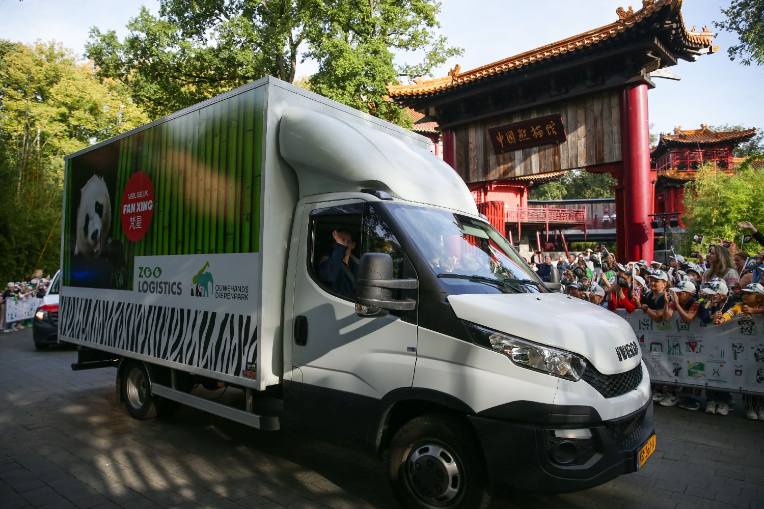 9月27日,装着大熊猫“梵星”的汽车启程离开荷兰雷嫩的欧维汉兹动物园。