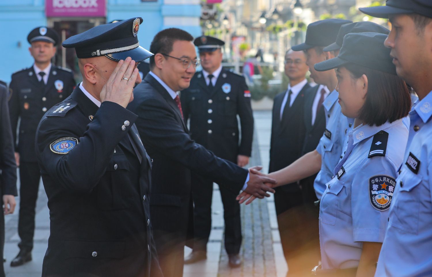 9月28日,在塞尔维亚首都贝尔格莱德,塞尔维亚内务部国务秘书布尔基奇(前左)在中塞警务联合巡逻启动仪式上向参与联合巡逻的中国警察致意。(图片来源:本文图片均自新华社)