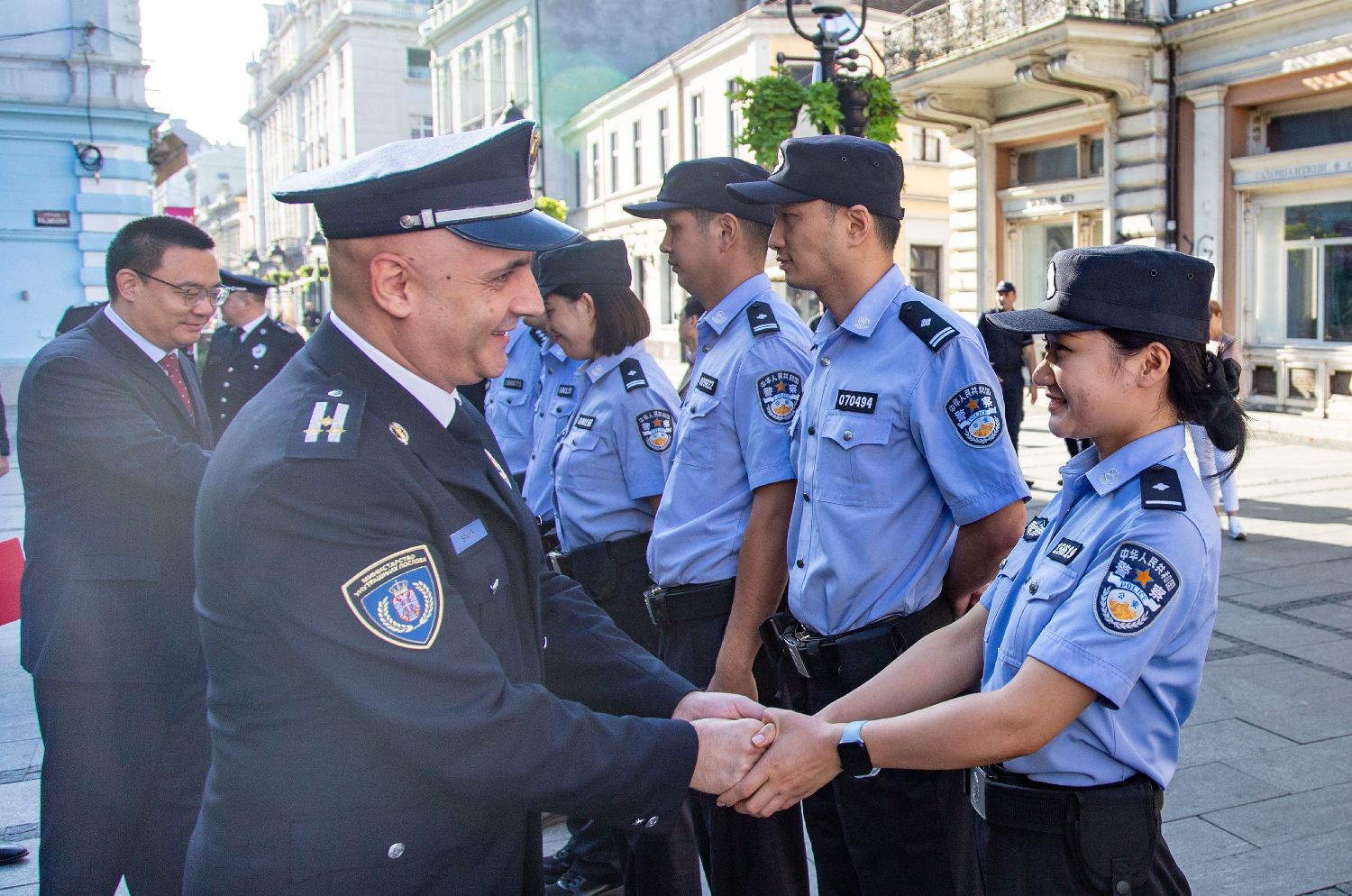 9月28日,在塞尔维亚首都贝尔格莱德,塞尔维亚内务部国务秘书布尔基奇(前左)在中塞警务联合巡逻启动仪式上与参与联合巡逻的中国警察握手。