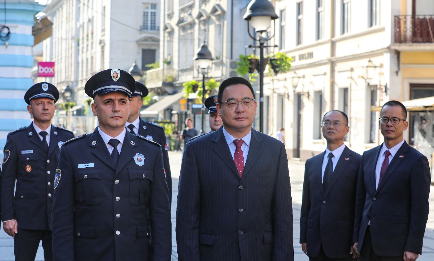 9月28日,在塞尔维亚首都贝尔格莱德,中国驻塞尔维亚使馆临时代办张喆(前右)与塞尔维亚内务部国务秘书布尔基奇(前左)出席中塞警务联合巡逻启动仪式。