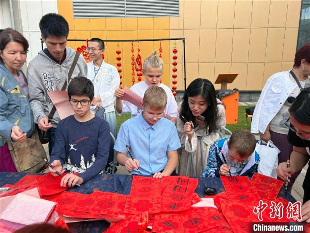 当地时间9月30日,“丝路情缘”——中国影视节目展播俄罗斯启动仪式在莫斯科举行,中俄青年共贺中秋晚会同时举办。图为在莫斯科548学校校园里举办的写汉字等文化互动活动。