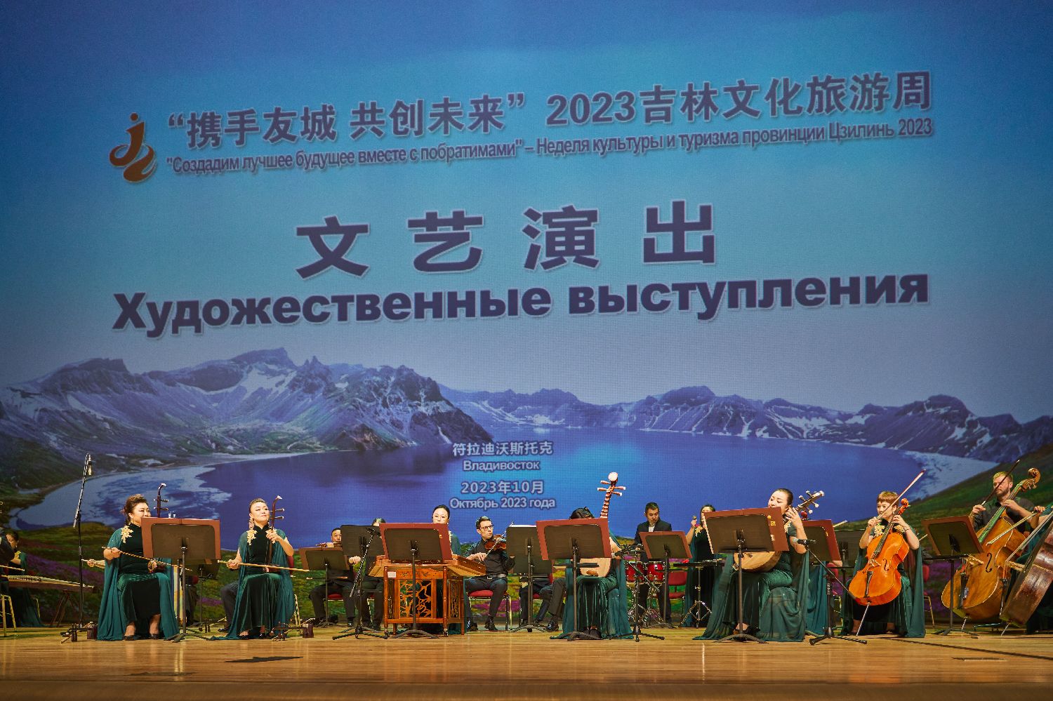 10月25日,吉林省交响乐团民族管弦乐队在俄罗斯符拉迪沃斯托克举行的“携手友城 共创未来”2023吉林文化旅游周开幕式上演奏。(图片来源:本文图片均自新华社)