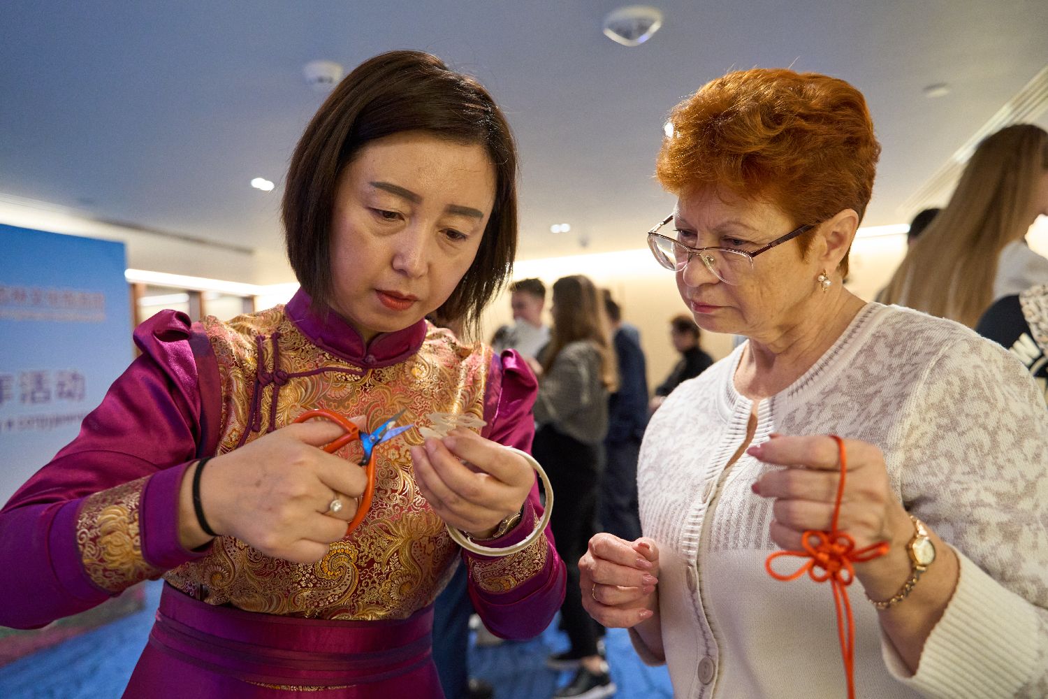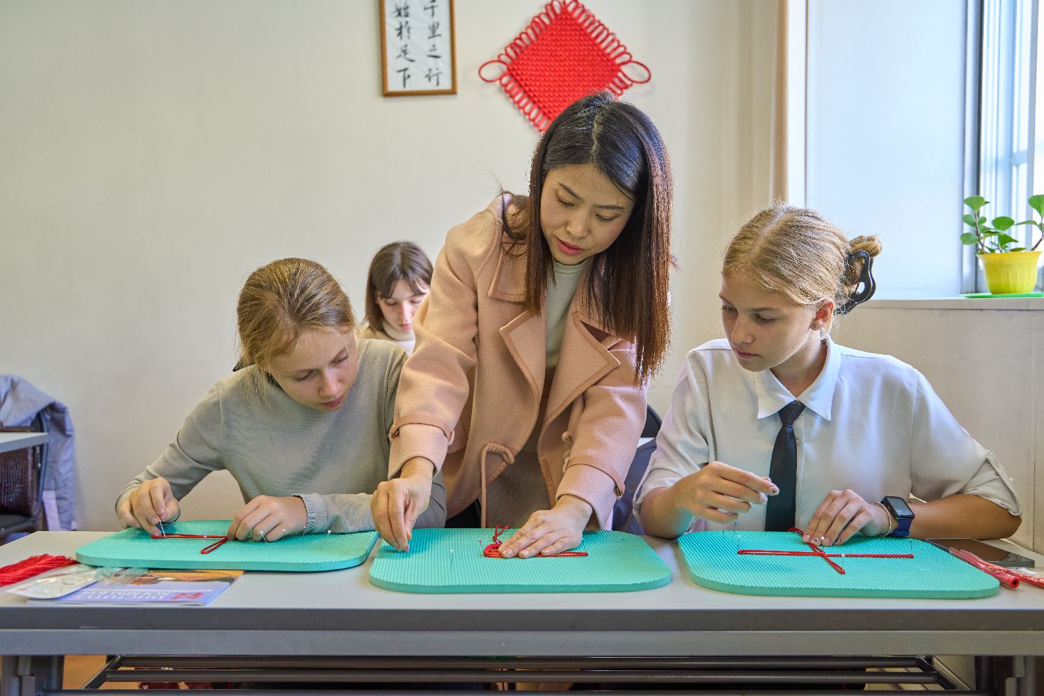 10月26日,在俄罗斯符拉迪沃斯托克的远东联邦大学孔子学院,来自吉林省的手工艺人徐晓雪(中)教学生制作中国结。