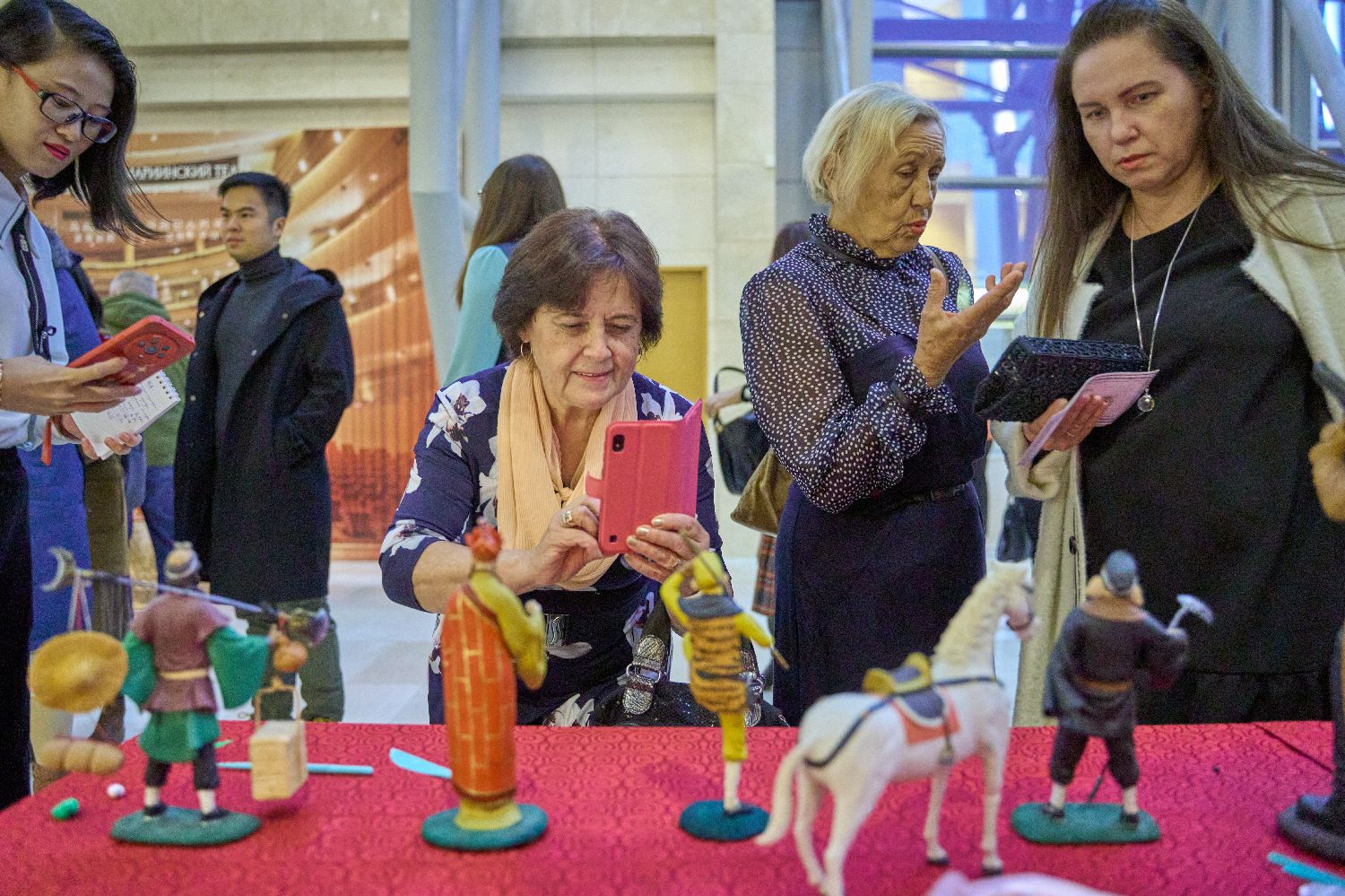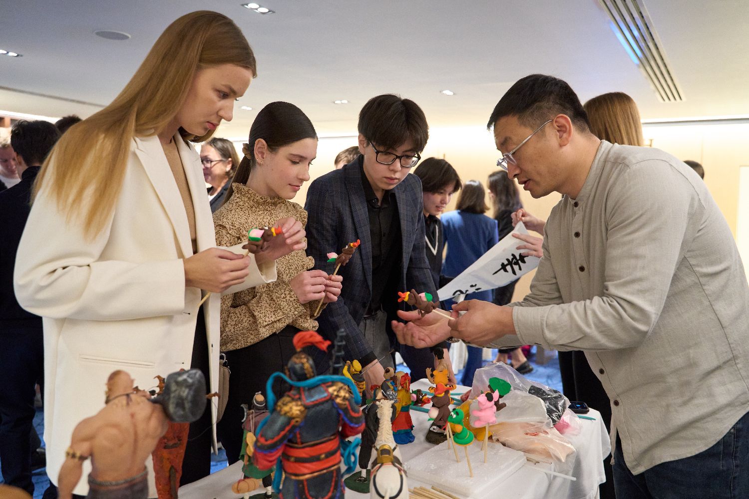 10月26日,在俄罗斯符拉迪沃斯托克,来自吉林省的手工艺人白春雨(右一)向观众展示面塑作品。