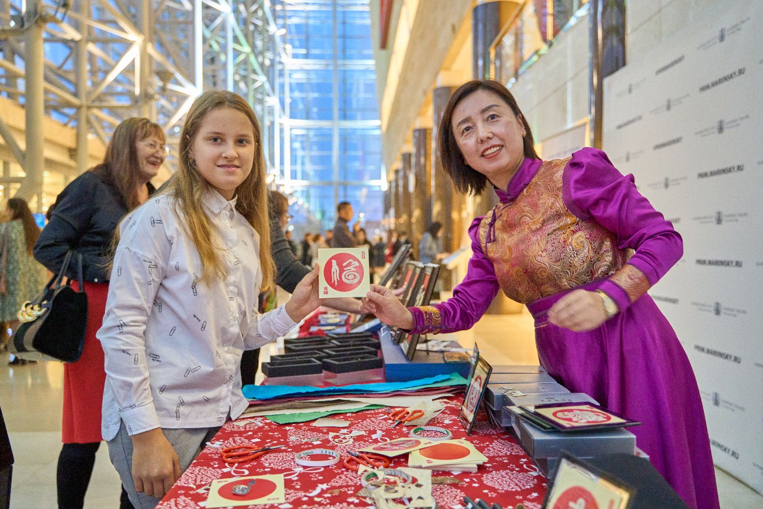 10月26日,在俄罗斯符拉迪沃斯托克,来自吉林省的手工艺人徐卉(左)向观众展示鱼皮画制作。