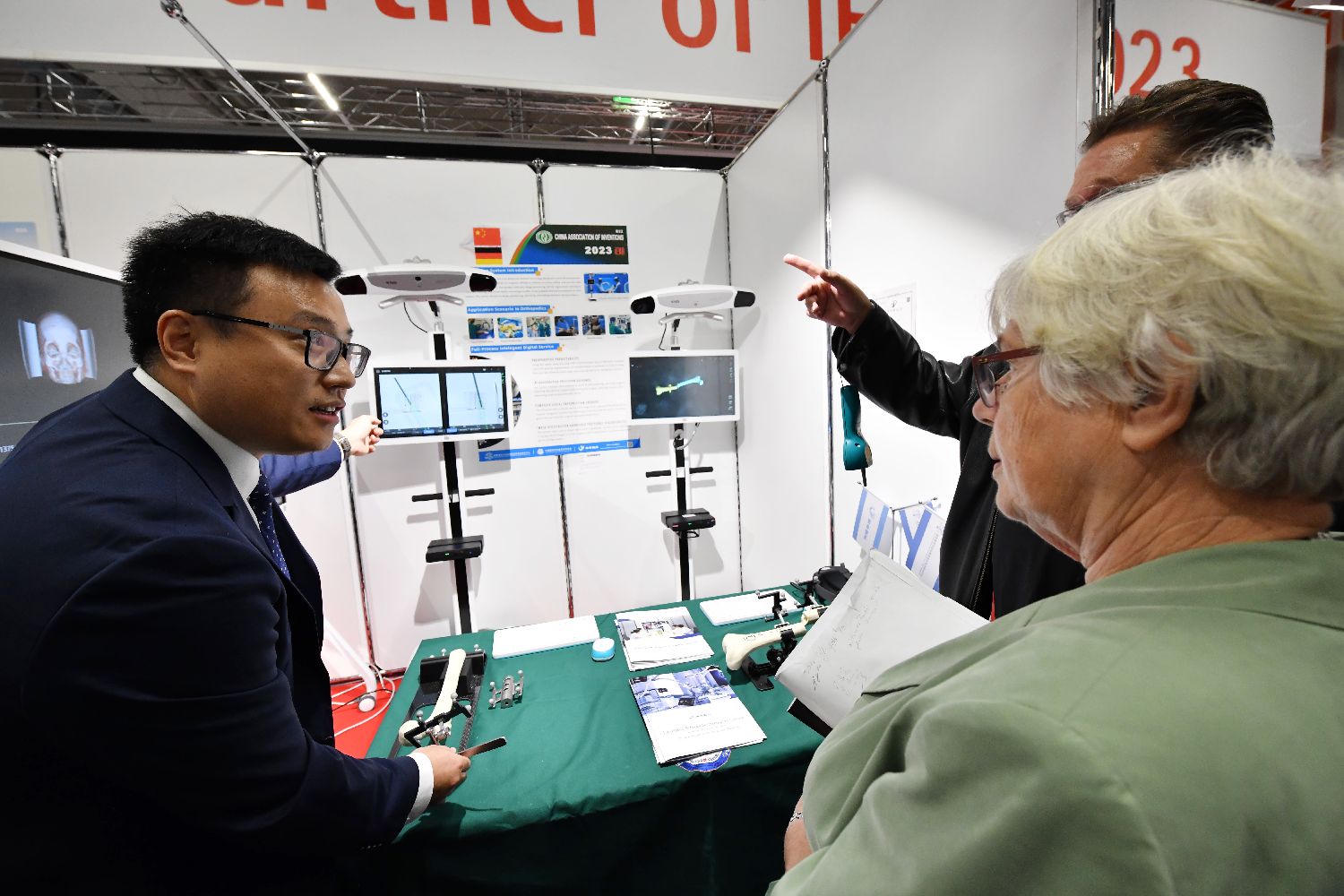 图为中国骨科与运动康复临床医学研究中心的工作人员(左)向参观者介绍一款智能手术导航系统。(图片来源:新华社)
