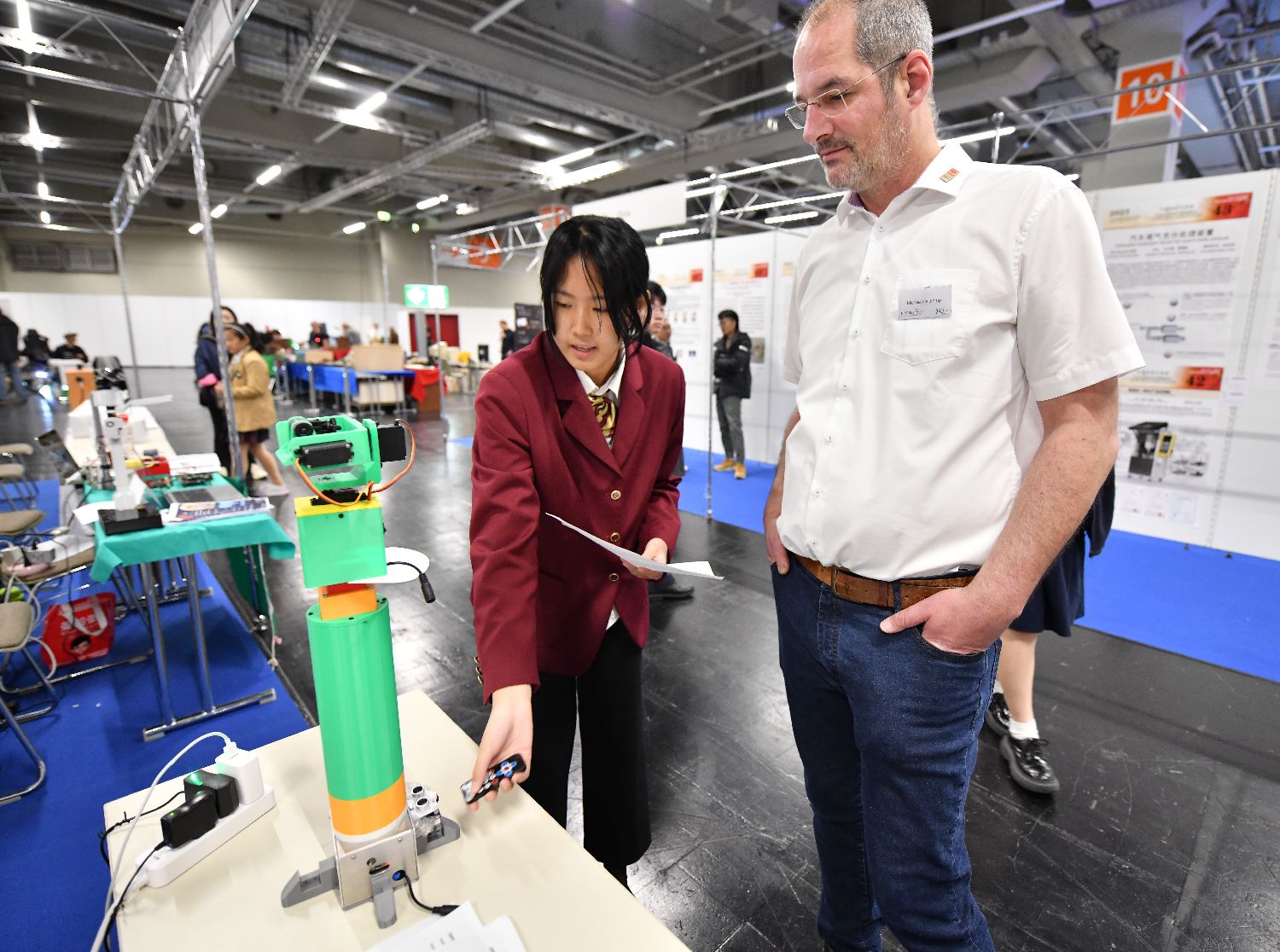 图为一名北京市第八十中学的学生向参观者介绍一款自稳定三脚架模型。(图片来源:新华社)