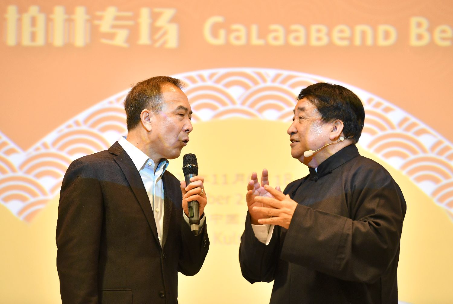 11月6日,相声表演艺术家姜昆(右)和搭档戴志诚在柏林第八届德国“中国曲艺周”闭幕演出中表演。