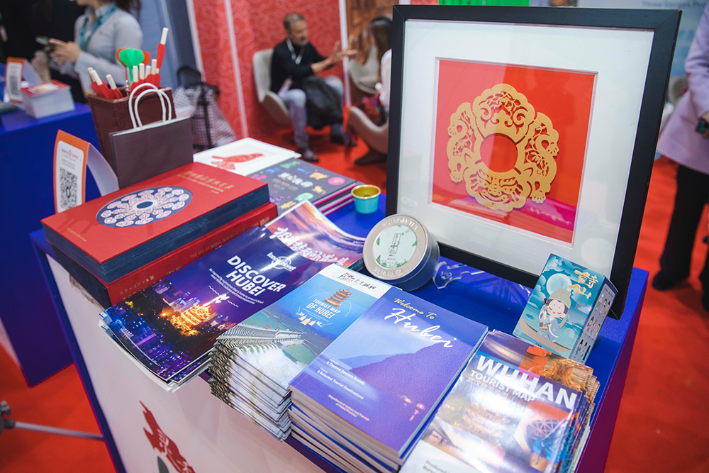 湖北展台突出“极目楚天舒”主题,通过图片和视频重点推介武汉、宜昌、十堰、恩施等省内重点旅游城市,口袋书、地图、手册、线路折页等宣传资料多样,诗人盲盒、黄鹤楼折扇、编钟摆件等文创产品更是吸引眼球,更有列入世界非物质文化遗产名录的鄂州雕花剪纸项目传承人,以实物展品展示和技艺演示互动相结合的方式,演绎了来自中国湖北的民间艺术,受到海外观众的热捧。