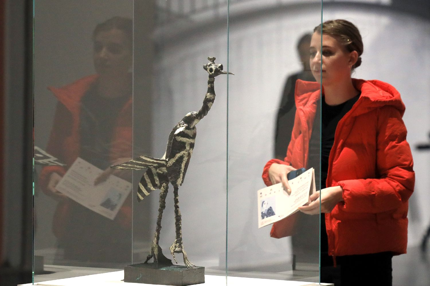 2023年11月10日,一名外籍观众在现场欣赏巴勃罗·毕加索的雕塑作品《鹤》。