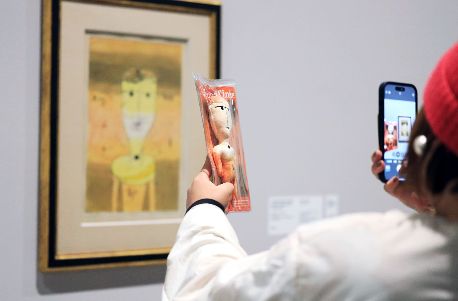 2023年11月10日,观众手持保罗·克利的作品《节俭男子的只言片语》同款人偶,在展品前拍摄。