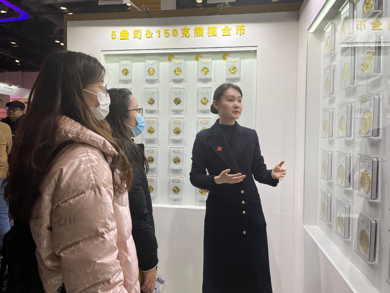 12月1日,参观者在博览会上听解说员讲解熊猫纪念币背后的故事。