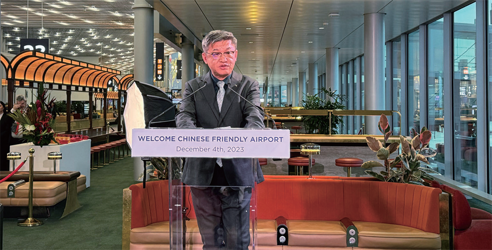 【欧洲时报靖树巴黎报道】12月4日,巴黎机场管理局(ADP)在戴高乐机场T1航站楼举行“中国游客友好机场”启动仪式。中国驻法国使馆陈栋公使、巴黎机场管理局首席执行官总裁罗曼内(Augustin de Romanet)等出席活动并致辞,共同展望中法文旅合作新一年。