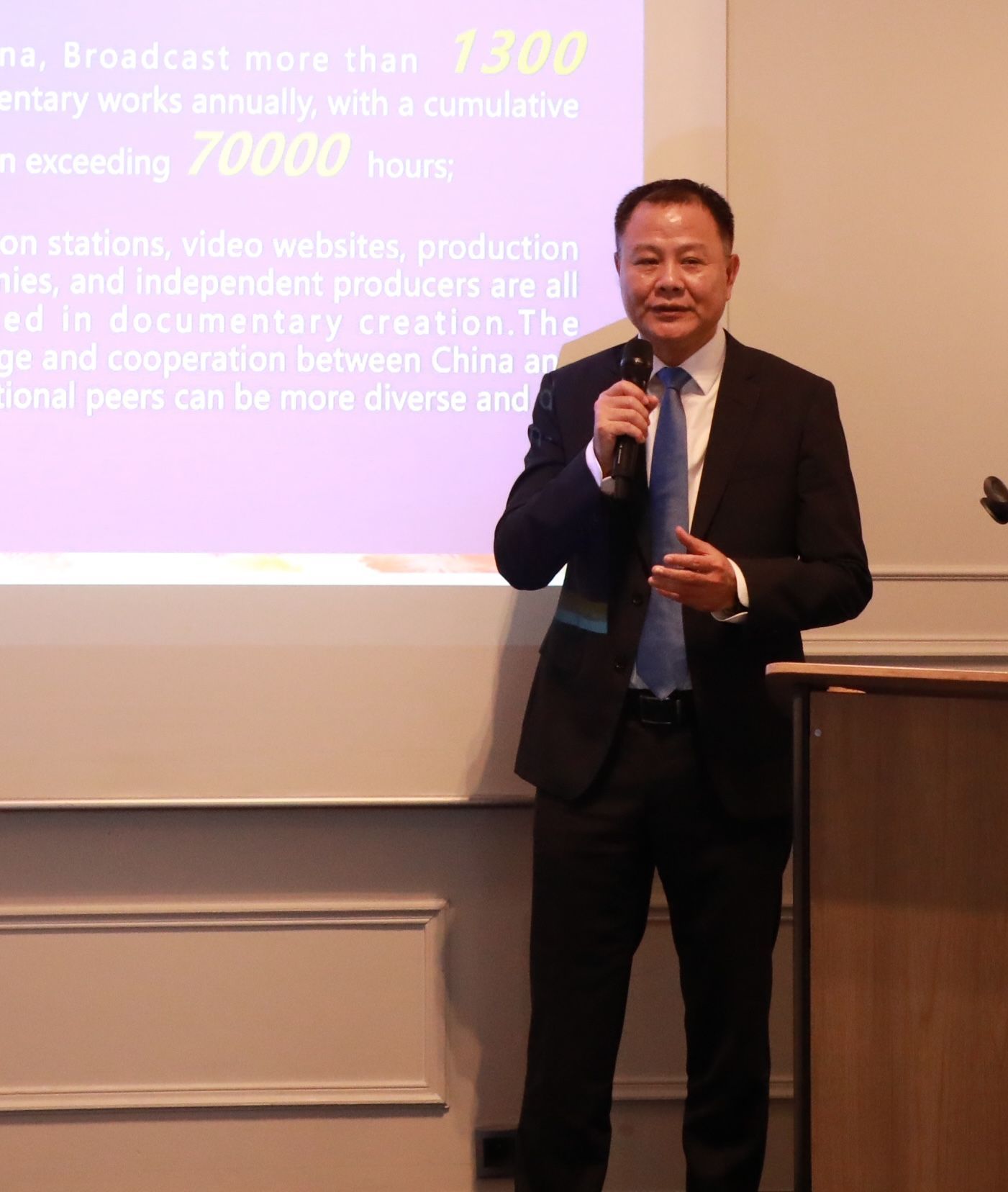 中国驻法国大使馆文化处参赞王茵在推介上致辞。她表示,明年是中法建交60周年,是中法文旅年,她希望中法创作者可以借助海丝国际纪录片大会这个平台,更好的交流,优秀的纪录片应该被世界看到。