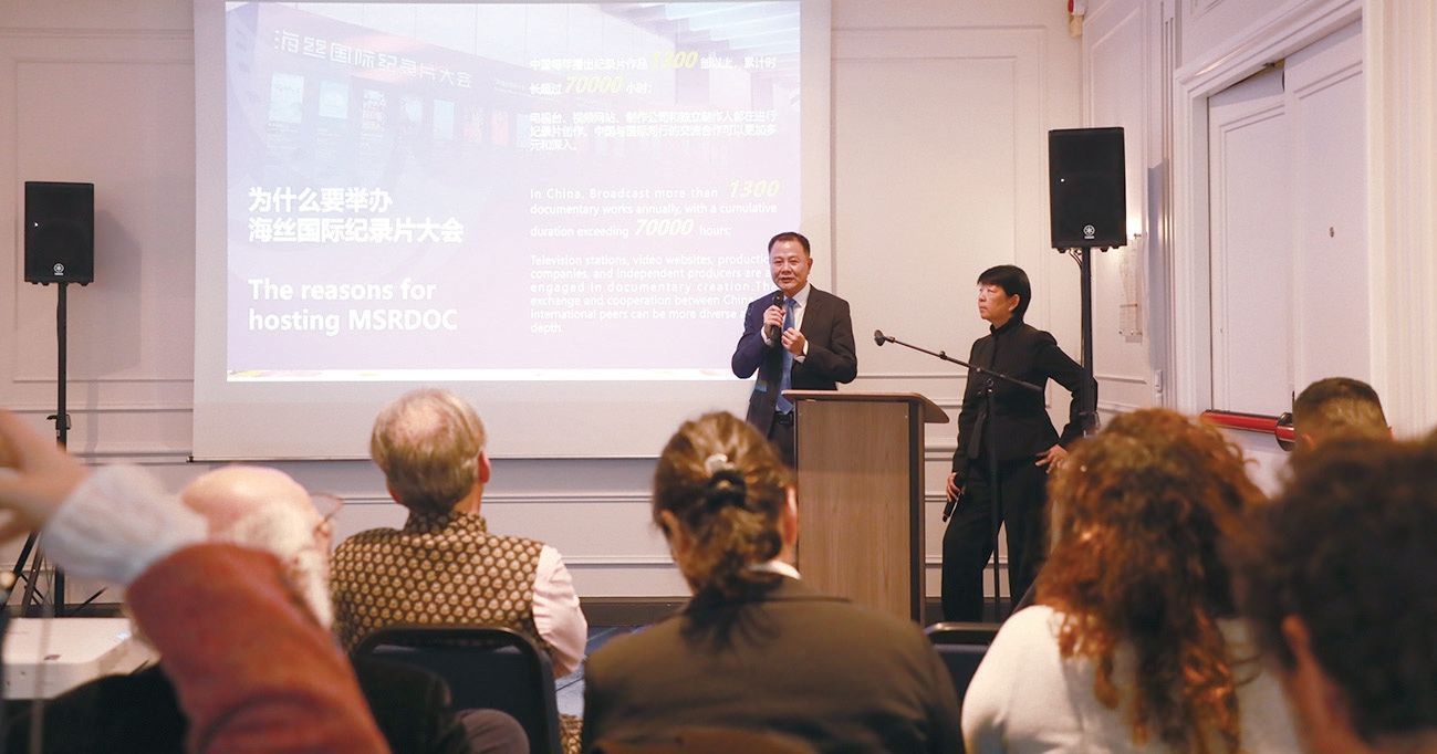 海丝国际纪录片大会创始人洪雷(左)和CNEX视纳华仁共同创办人暨执行长陈玲珍共同向中法嘉宾作推介。