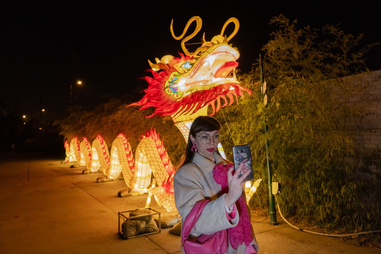 12月16日,在匈牙利布达佩斯举行的“欢乐春节”中国龙年彩灯节上,参观者在彩灯前自拍。(图片来源:本文图片均据新华社)