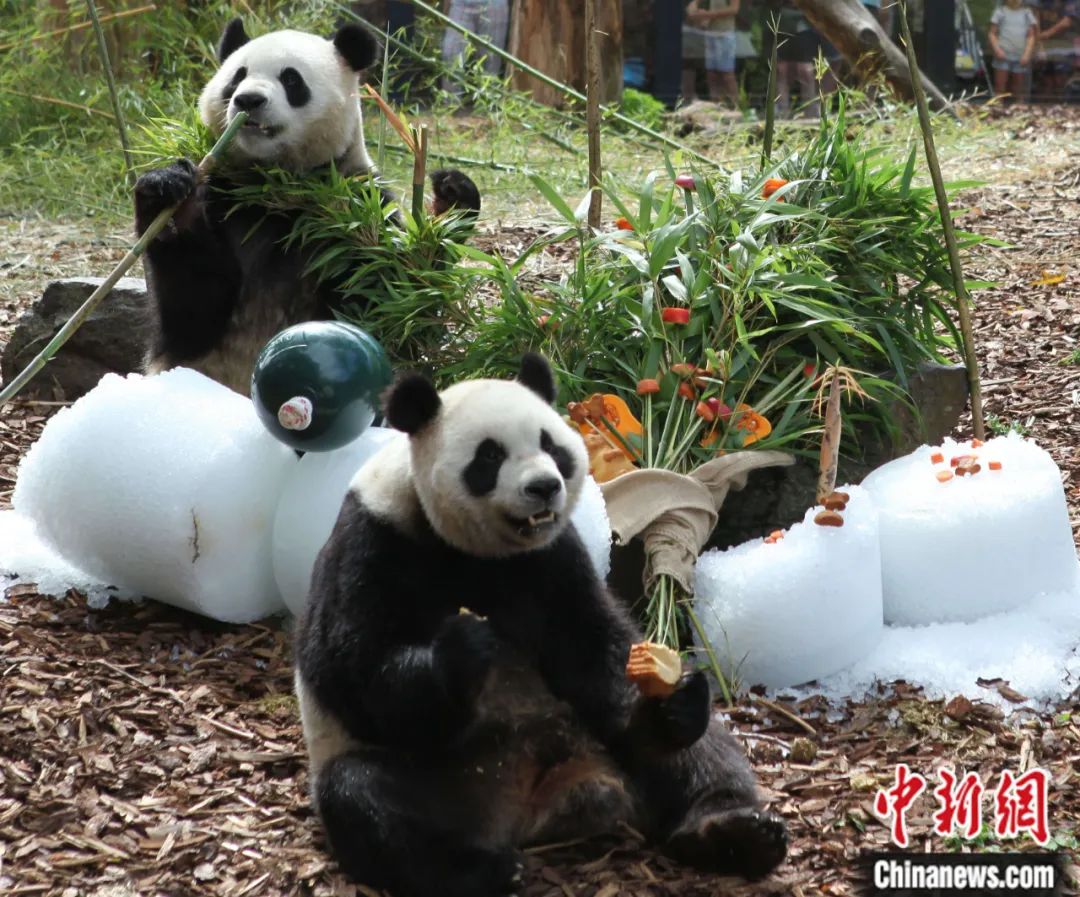 2023年8月,天堂动物园中大熊猫“宝弟”“宝妹”品尝特制的“生日蛋糕”,庆祝4岁生日。(图片来源:中新网)
