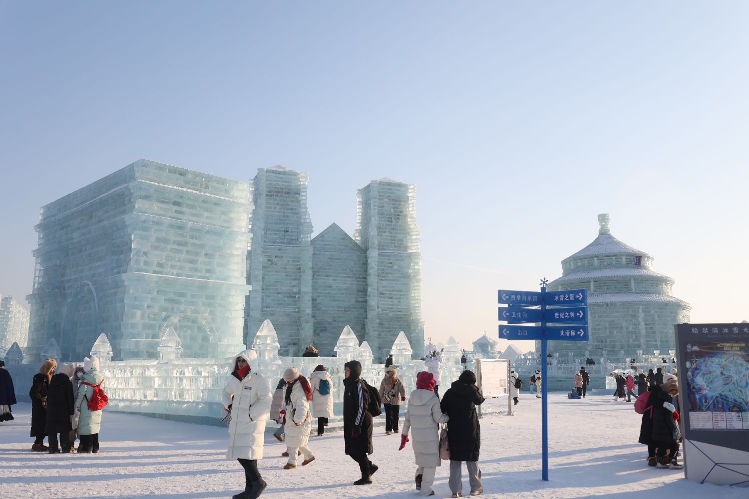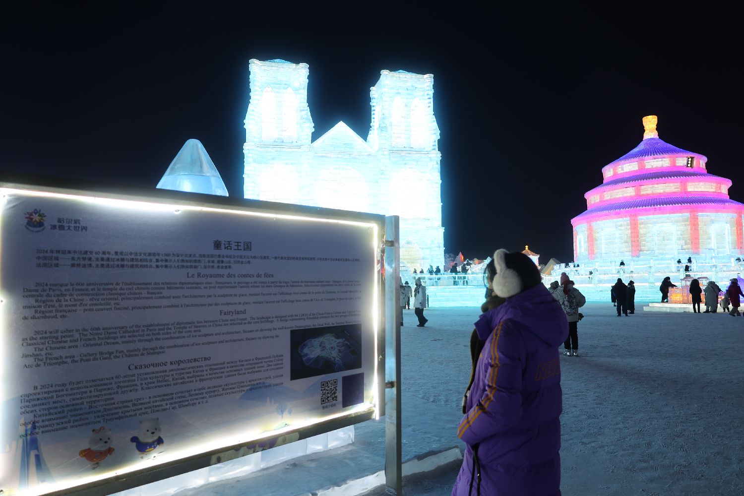 2024年1月5日,第40届中国·哈尔滨国际冰雪节和中法文化旅游年同时在哈尔滨冰雪大世界拉开帷幕。中法两国的地标性建筑,“北京天坛”和“巴黎圣母院”在冰雪大世界露出真容。