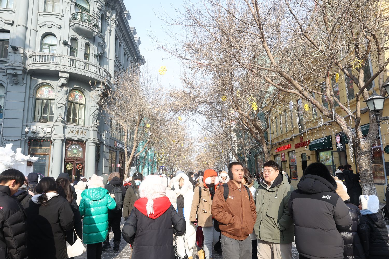 哈尔滨中央大街步行街为中国第一条商业步行街,建有欧式及仿欧式建筑71栋,汇集文艺复兴、巴洛克、折中主义及现代多种风格保护建筑13栋,有“中国的香榭丽舍大街”美誉。图为游客们在中央大街步行街上游览“打卡”。
