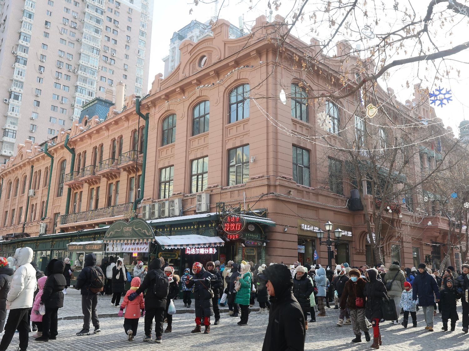 马迭尔宾馆坐落在哈尔滨中央大街上,始建于1906年,无论从造型还是装饰上,均属典型的法国文艺复兴时期新艺术运动建筑风格,有东方的“凡尔赛宫”之称。当时,该宾馆的俄国建筑师非常痴迷法国的艺术形式,因此法国最为时髦的新艺术风格经彼时的俄国建筑师之手在哈尔滨的街巷上流行,又将哈尔滨变成了“东方小巴黎”。