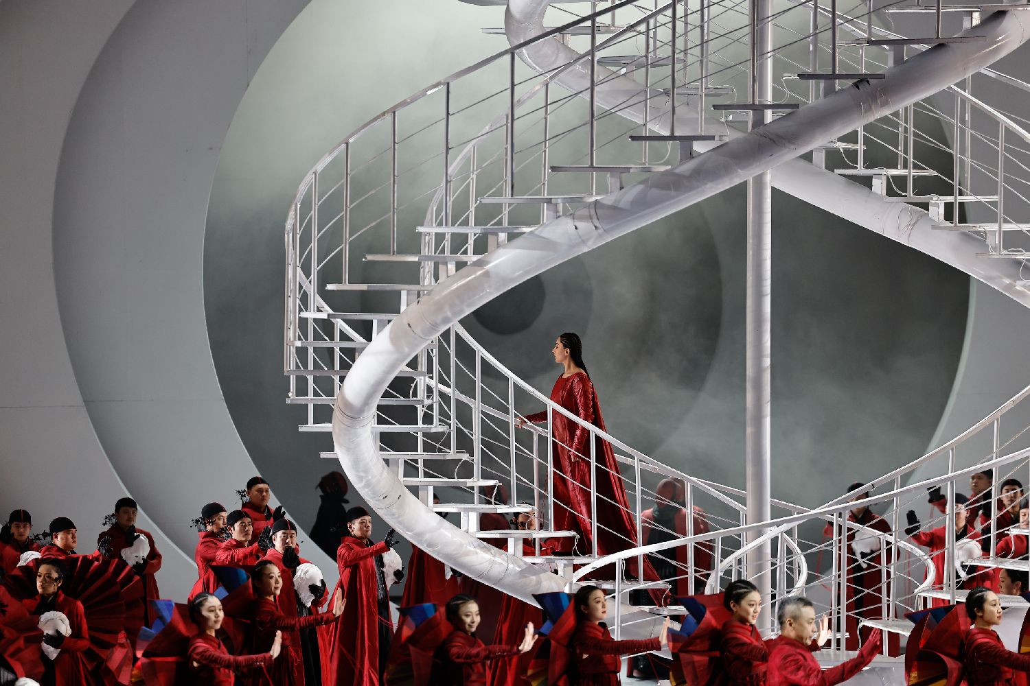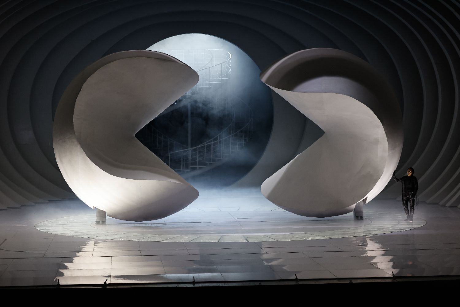 当序曲的音乐响起,大幕缓缓升起,简约的纯白舞台呈现在观众眼前,巨大的弧形线条充斥了整个空间,果真犹如“时空隧道”一般向深处延伸,正如导演斯特法诺·波达所说:“某种层面这也意寓人类历史仿若一个永恒且周而复始的旅程,炫目又雷同。”