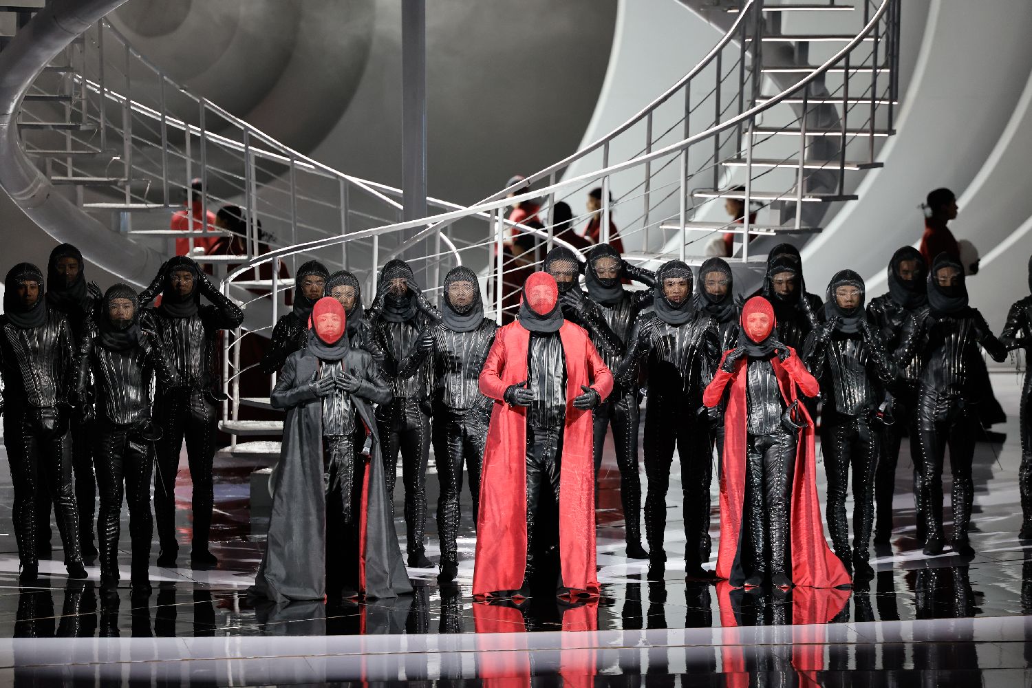 2024年1月25日,身着皮质击剑服、佩戴击剑面罩的演员们在中国国家大剧院舞台演出。