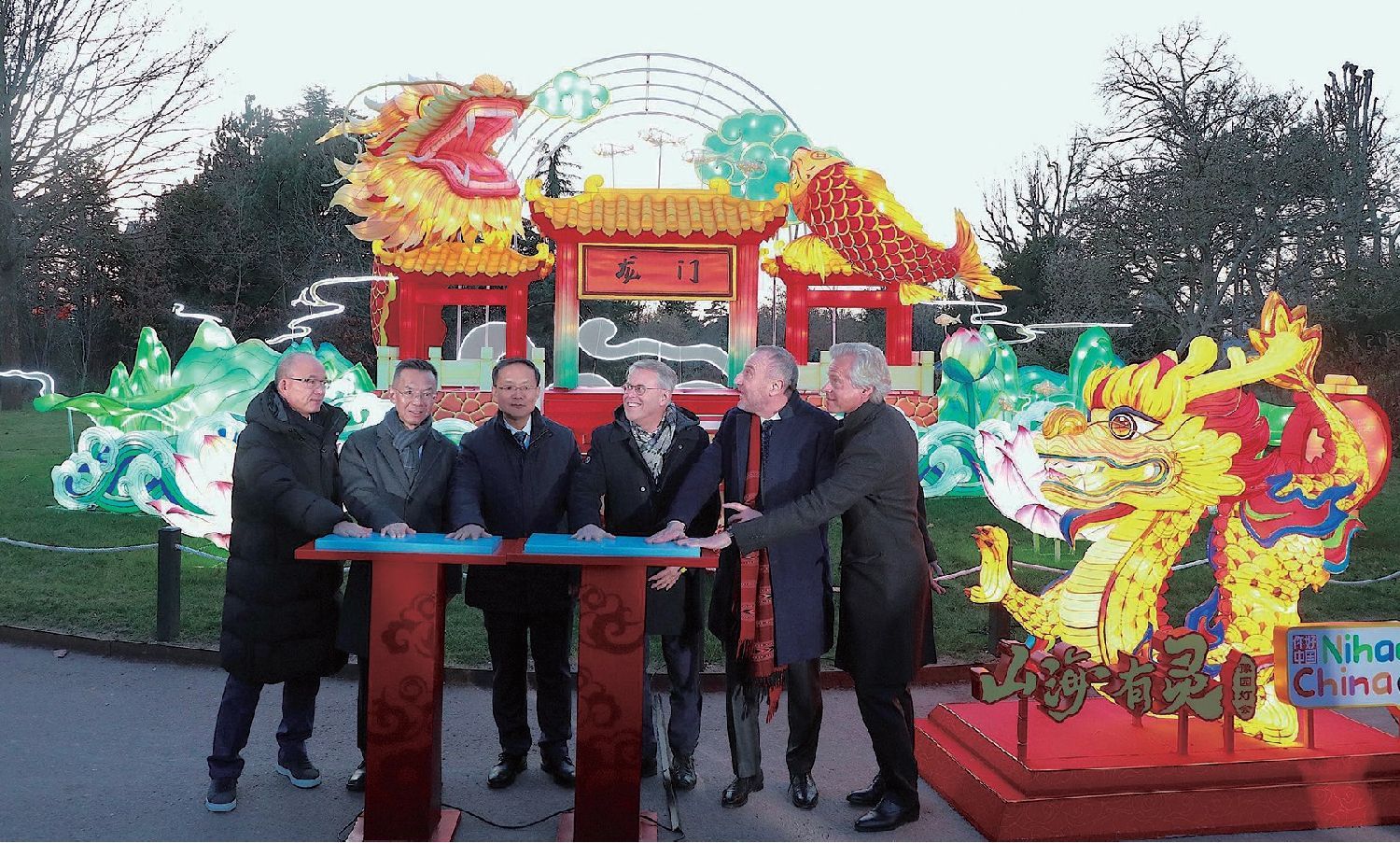 中国驻法国大使卢沙野、复星国际董事长郭广昌、法国国民议会法中友好委员会主席艾里克·阿罗泽(Eric ALAUZET)、巴黎风情园园长、路威酩轩集团秘书长马克-安托万·贾梅(Marc-Antoine Jamet),在中国文旅部龙年主题点灯台前一同按下了“吉祥龙”的亮灯键盘,由此点亮当晚的法国豫园灯会。