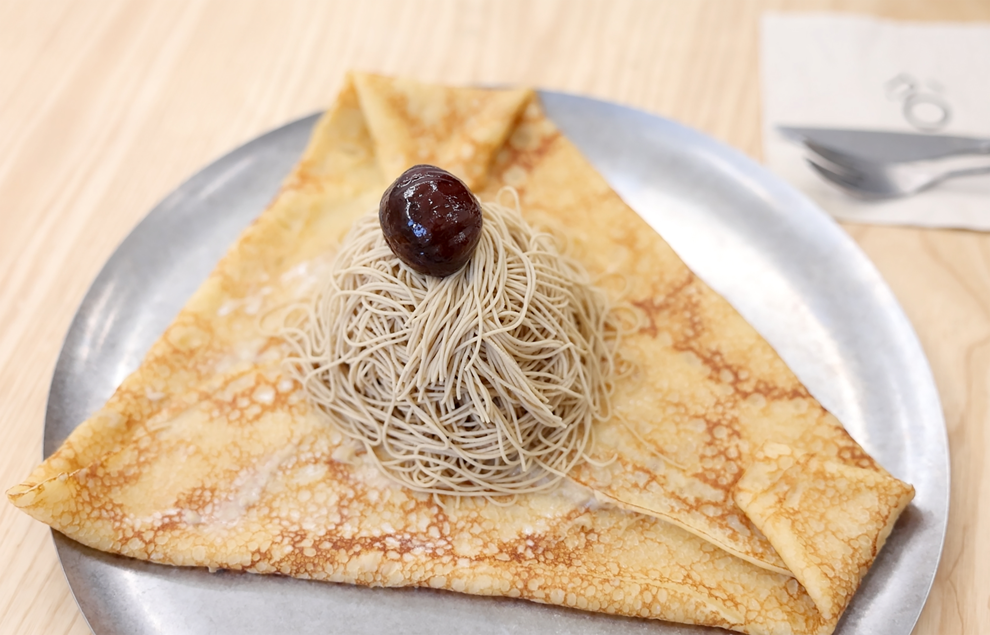 北京OùCafe推出的一道采用法国传统甜点蒙布朗加上布列塔尼地区可丽饼结合的甜品——“Où蒙布朗栗子可丽饼”。