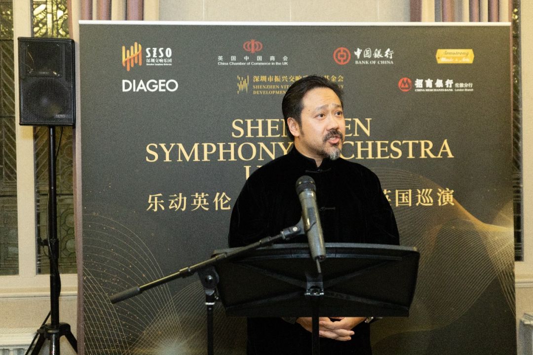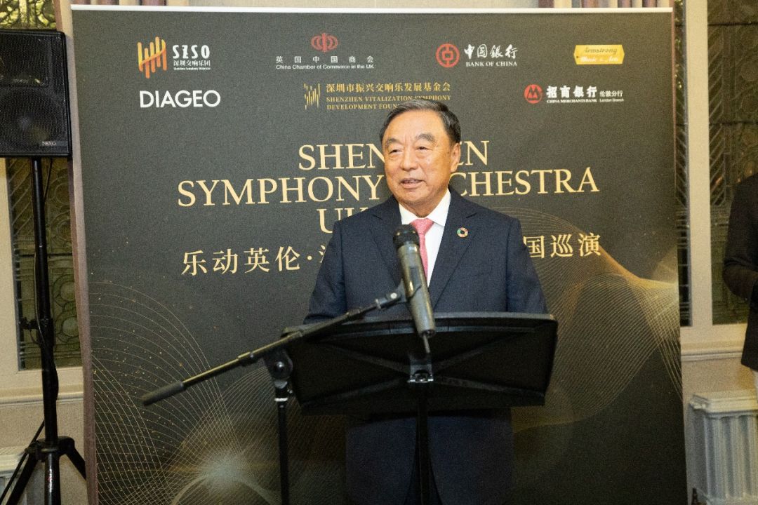 英国中国商会主席、中国银行伦敦分行行长方文建在致辞中高度评价了深圳交响乐团此次跨洋来英巡演的重要意义,他认为此次巡演为中英两国间的文化交流营造了一个双方知音共聚的难得机会。本次伦敦音乐会得到了英国中国商会成员中国银行及招商银行伦敦分公司的支持,对此方会长表示,商会很荣幸支持中国交响乐走向英国、走向世界,这标志着一个中国文化传播的新起点,借此机会可以更好地推动中英文化交流,增进沟通理解,加强民间外交,传播中国故事。